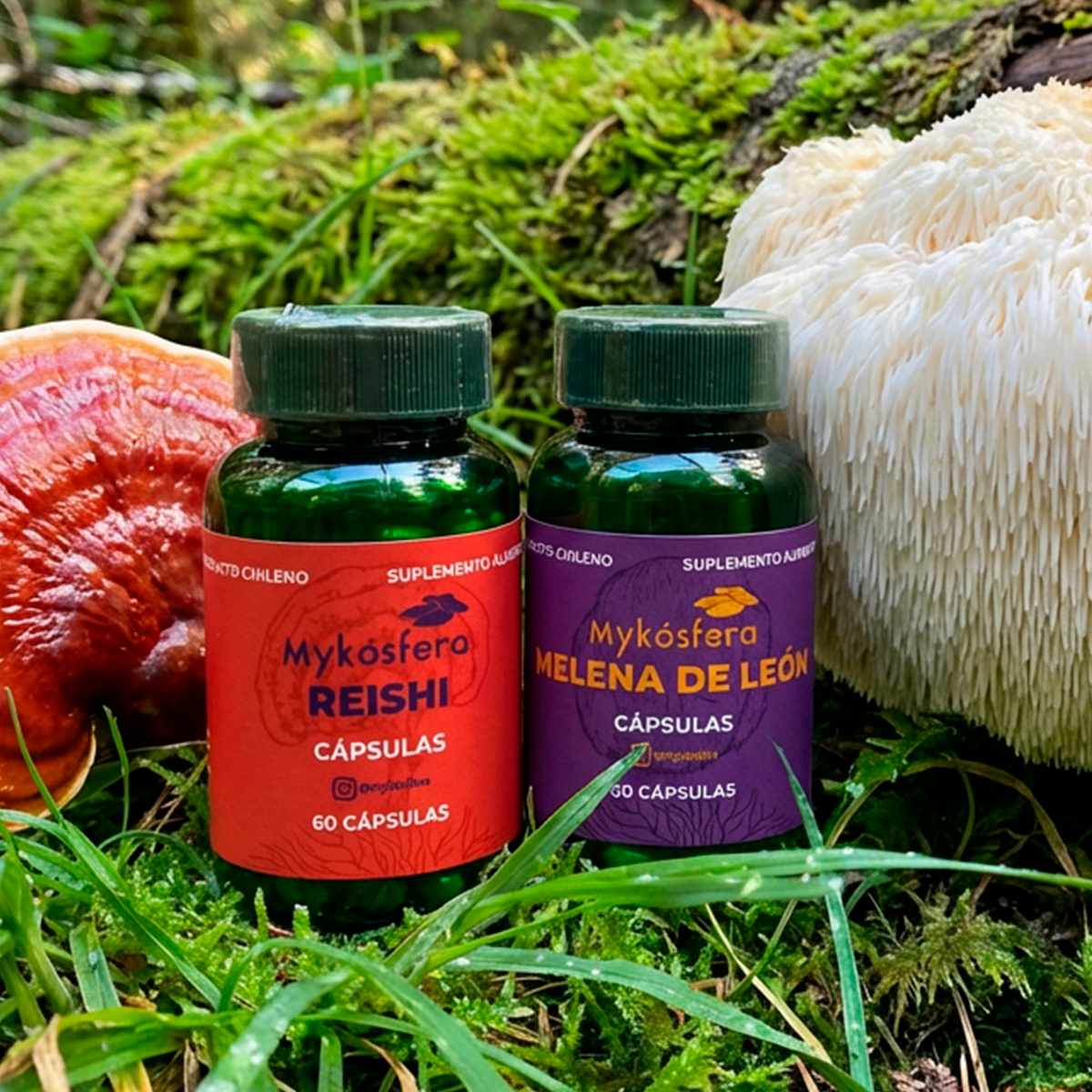 Formato: 1 frasco de cápsulas de Melena de león y 1 frasco de cápsulas de Reishi con 60 cápsulas c/u. (300mg c/u).